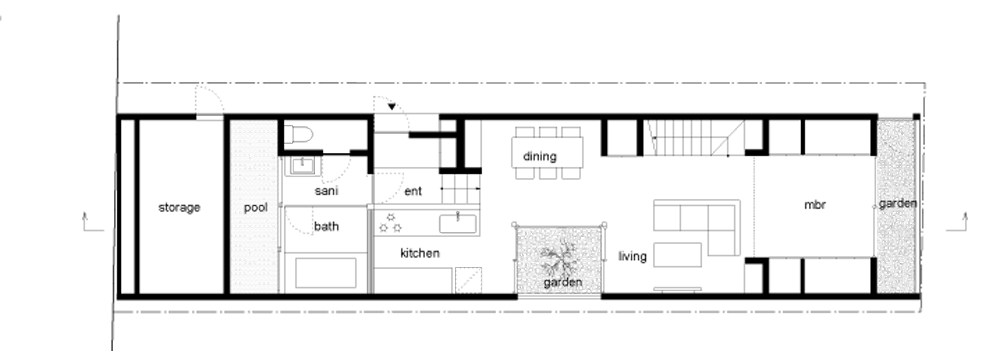 開口部は敷地の東西にある中庭にのみ面しており、南北方向には開口部は全く設けてありません。