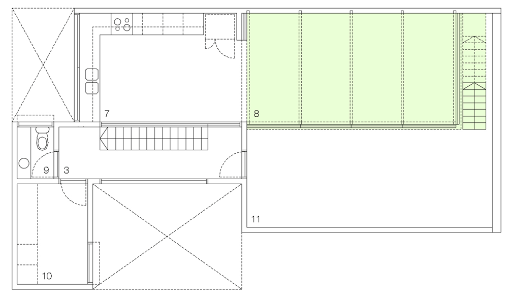 次にテラスの半分利用して、台所・食堂・居間を一か所に収容できる明るいスペースを増築します。