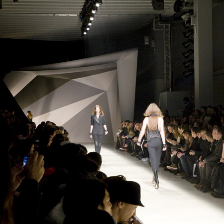 イタリアの建築設計事務所AquiliAlbergが、先週ミラノにて開催されたファッションデザイナー ニール・バレット/ Neil Barrett's氏のコレクション・ショーで角張った形状の遠近背景を制作した。