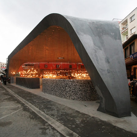 イケアで使用している420個の収納ボックスを使って、ポルトガルのデザイナー、ディアゴ・アギアール氏とテレサ・オットー氏がデザイン及び建築した即席のバーは、ポルトガルにあるポルト大学建築学部主催コンクールの受賞作品だ。