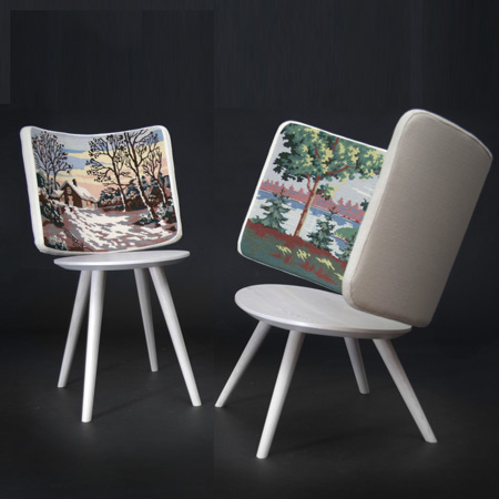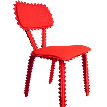 スロバキアのデザイナー Peter Jakubik氏が木の幹にチェーンソーで切り込みを入れて制作した椅子は、かの有名なパントンチェアー(座部から脚部まで一体成型の椅子)をイメージさせる作品だ。