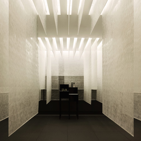 イタリアのスタジオAntonio Ravalli Architetti は、イタリア、ヴェローナの倉庫1階を改装し、天井から吊るしたギャザーのきいた透明なカーテンを特徴としたショールームにしました。