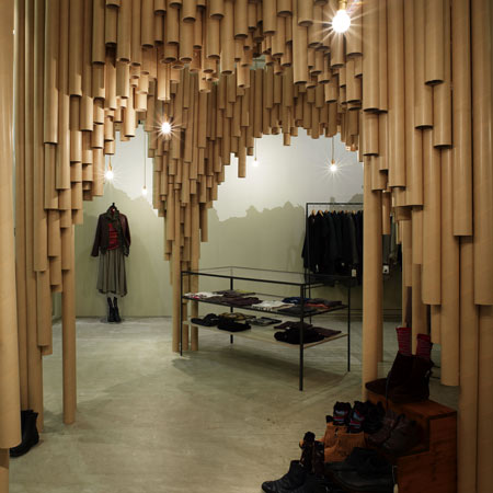 メルボルンのデザイン事務所、March Studio がオーストラリアのスキンケアブランドの Aesop のためのこの店舗デザインには、4500個のダンボール箱をネットで閉じ込めた空間が広がる。