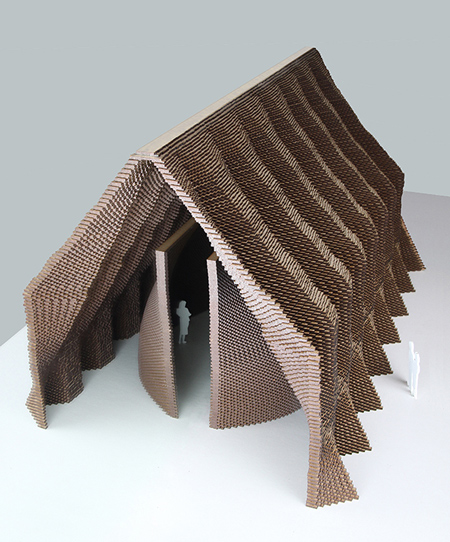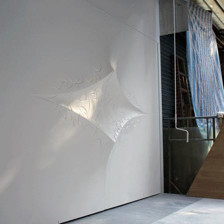 縫い合わせたゴム製のシートにコンクリートを流し込んで制作した、学生によるプロジェクトを紹介しよう(過去の関連記事: Grompies by AA students in our earlier story)。この作品は、ミシガン大学(University of Michigan)で建築を専攻する3人の学生(Kyle A. Sturgeon、Chris Holzwart、Kelly Raczkowski)によってデザインされた。