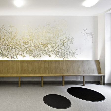チェコ共和国にあるデザイン・スタジオA1 ArchitectsのLenka KřemenováとDavid Maštálka両氏がプラハにデザインした歯科クリニックの室内は、歯や動植物のイラストが描かれた壁で囲まれている。