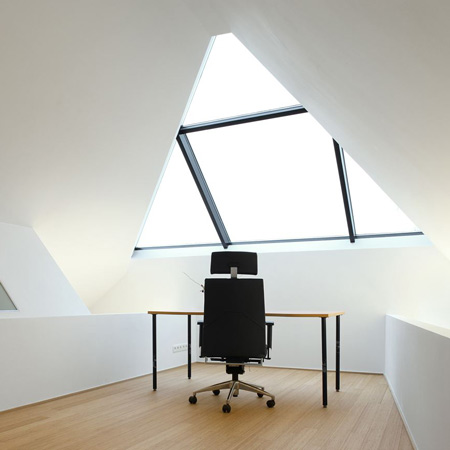 ブリュッセルの設計事務所ラベル・アーキテクチャーがベルギーのブリュッセルにある民家の、壁の一部をザラザラした黒い配向性{はいこうせい}ストランドボードで覆い、残りを白に塗るという改装を手がけた。