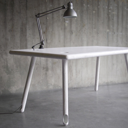 ストックホルムのデザイン事務所Tb & AjakayがKarl-Johan Hjerling とKarin Widmark とのコラボレーションで、テーブルトップの合板の層がバラバラにはがれて一端に巻き込まれたテーブルをデザインした。