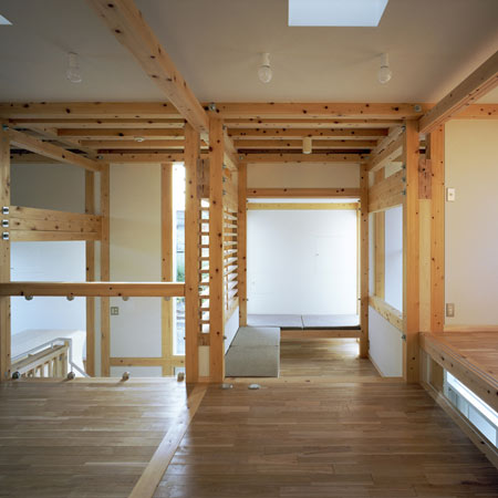 日本の建築事務所、Suppose Design Office による設計で広島市に建てられたこの住宅は、連続する居室とプラットフォームを形成する、それぞれの木製のボリュームに分岐する中央階段をもつ。