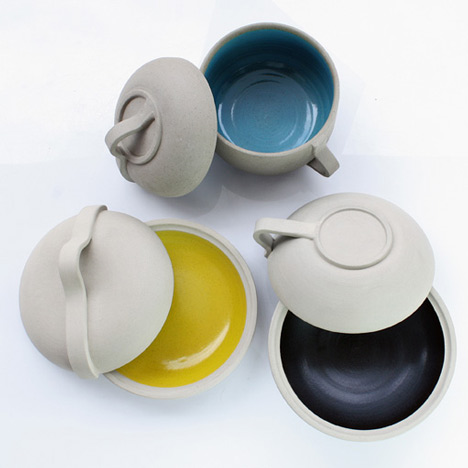 American designer Louie Rigano has created a range of teapots that combines mass-produced wooden handles and lids with individual hand-thrown bodies.